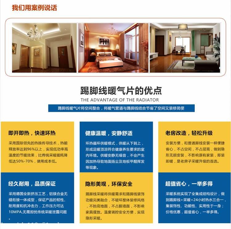 众说周知,近年来,大众的生活水平越来越好,对更高生活质量的追求愈加高,特别是在采暖行业。现在,市场上的壁挂式散热器和地暖是由于它们自己的暖气。缺陷是,或在墙壁上抽烟,占有空间,或能耗高,加热缓慢,日趋不能满足人们逐渐严苛的需求。博睿之星顶脚线隐形加热的出现满足了消费者的隐形加热需求,镁铝合金material既身心健康又环保。密集的构造设计完美地结合了踢脚板的装饰性和加热功用。加热效用令消费者令人满意,构造简便方便,经久耐用的设计使用寿命漫长50年。,市场前途火爆,您的企业是一个好项目,一个差强人意的选择!